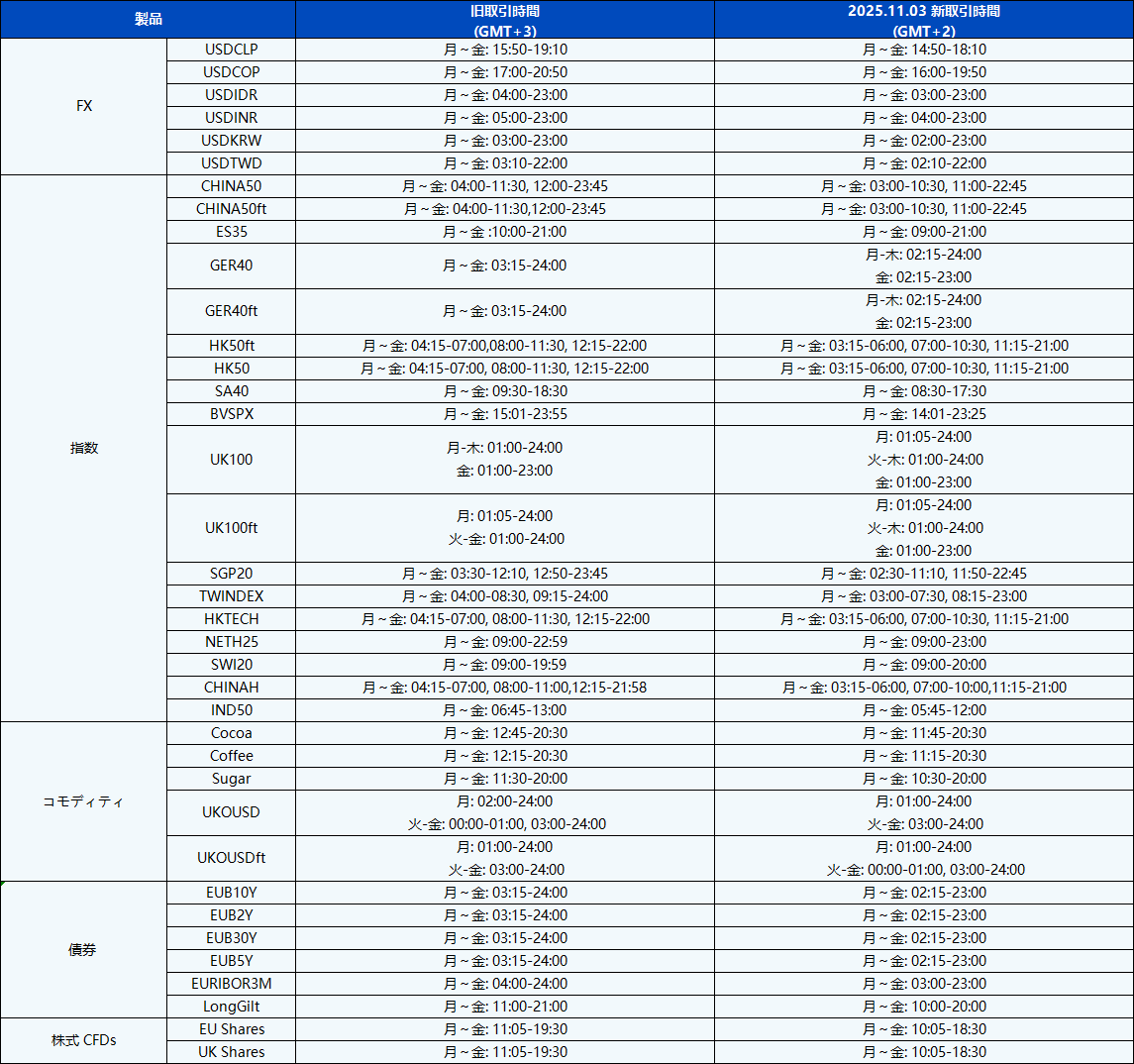 こんにちは!2025年11月2日に実施される米国夏時間に伴い、MT4/MT5のシステム時間帯がGMT+3からGMT+2に変更され、2025年11月3日よりPU Primeの取引スケジュールが変更されます。