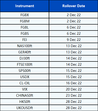 Please be advised that the following CFD instruments will be automatically rolled over as per the dates in the table below. As there can be a pricing difference between old and new futures contracts, we recommend clients to monitor their positions closely and manage positions accordingly.