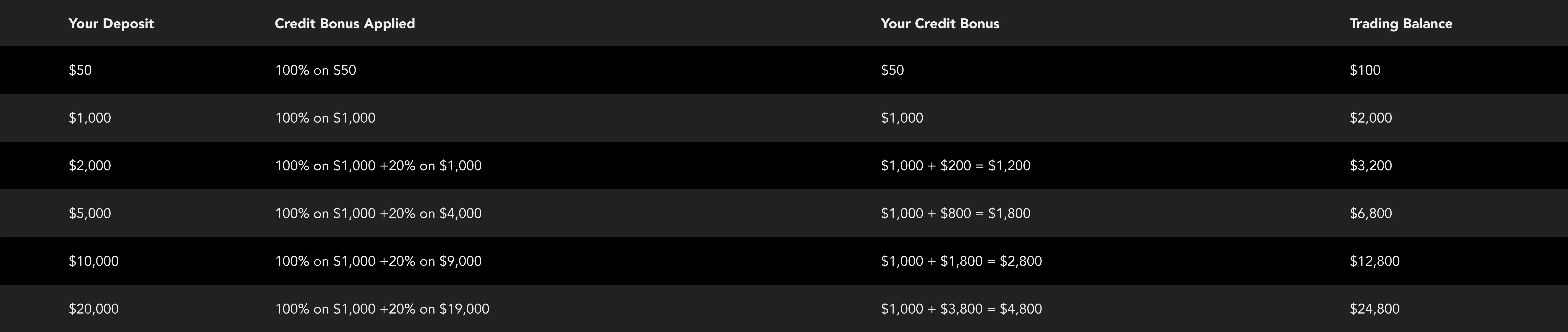 *Any profits generated from closed orders can be withdrawn at any time. However, withdrawing any portion of your original deposit will result in the proportional removal of your credit bonus. Transferring funds between your trading accounts is also considered withdrawal.