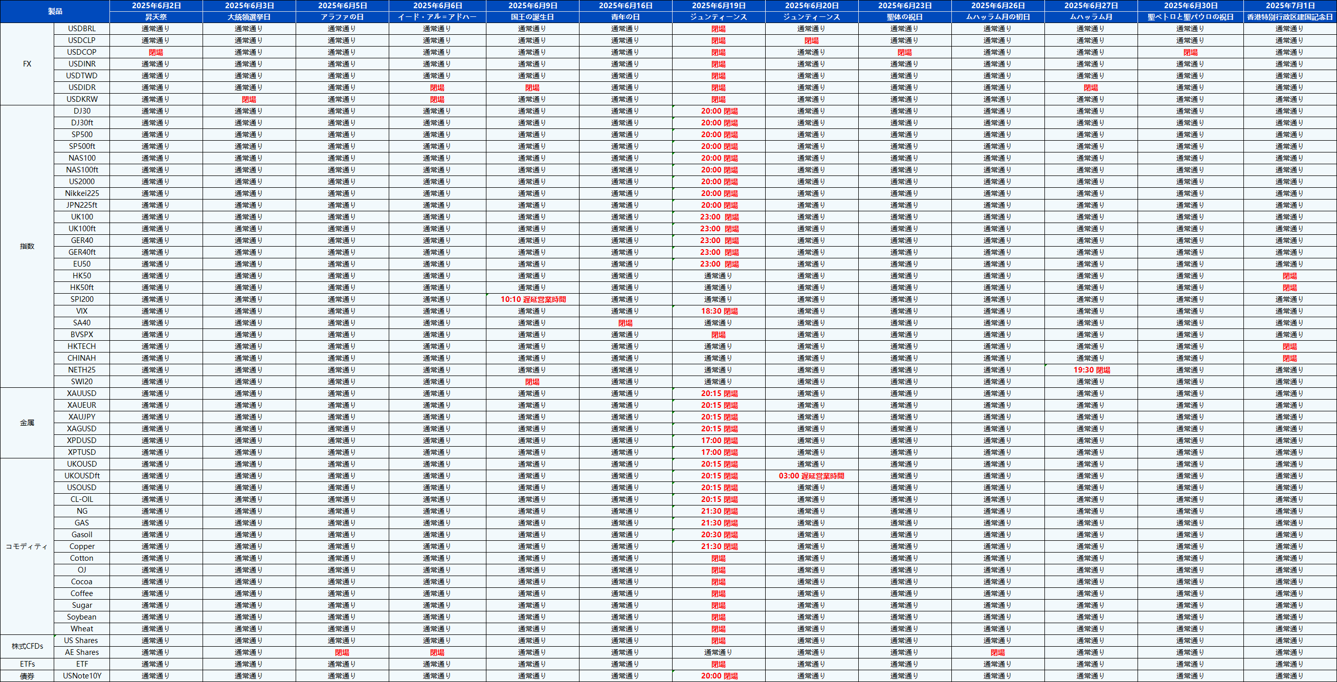 6月の連休に伴い下記の商品の取引時間および立会時間が変更となります。