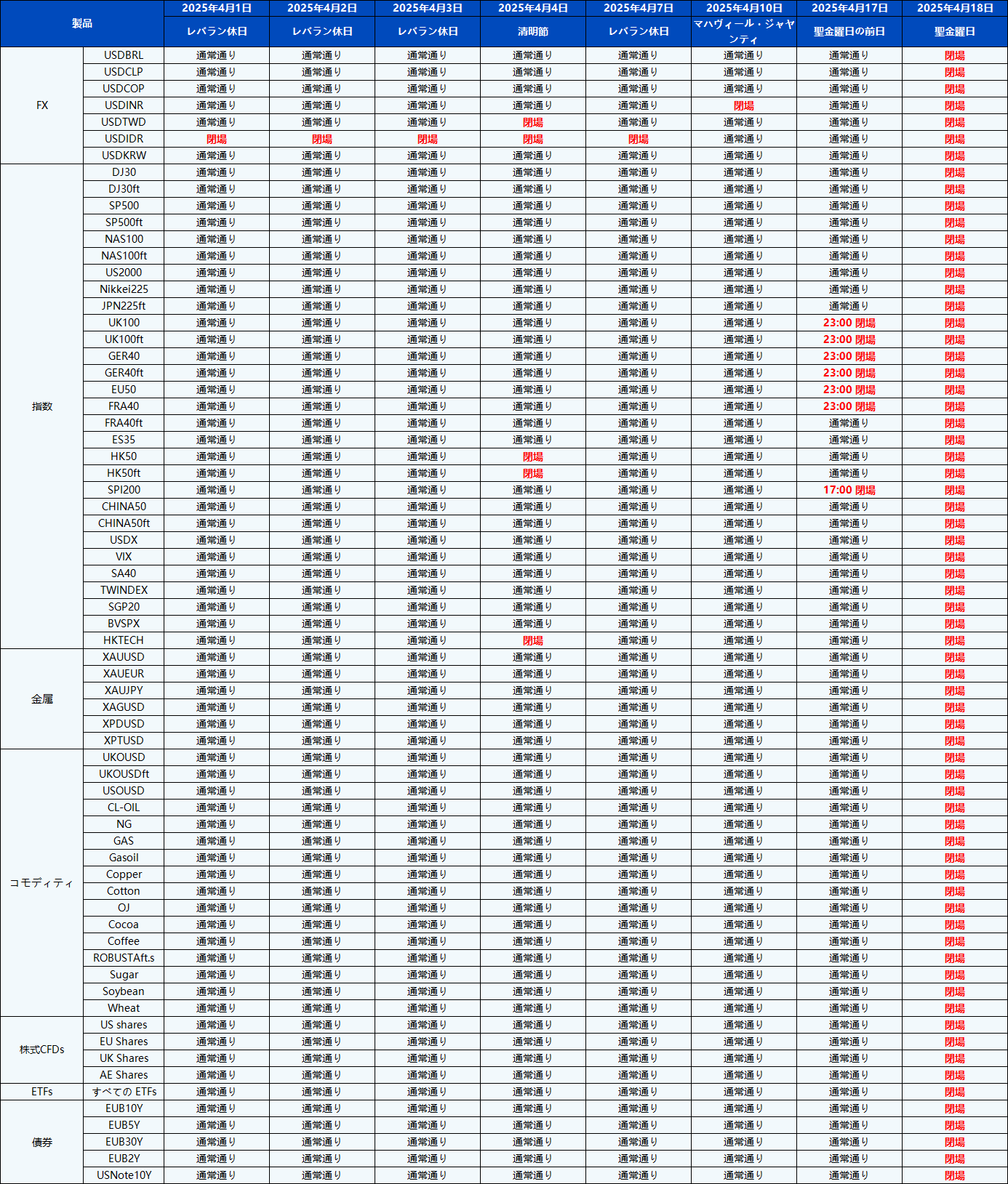 以下の製品の取引時間と市場セッションの時間は、4月上旬の休日の影響を受けることにご注意ください