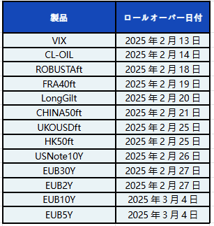 以下のCFD商品は、下表の日付に従って自動的にロールオーバーされますのでご注意ください。新旧の先物契約に価格差が生じる可能性があるため、お客様はポジションを注意深く確認し、それに応じてポジションを管理することをお勧めしております。