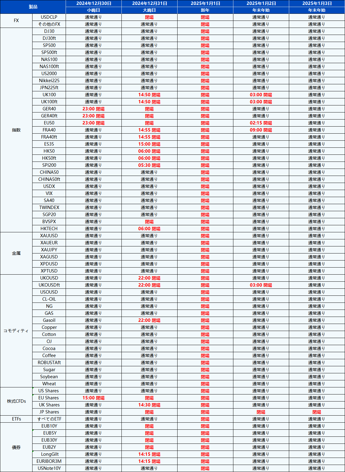 年末年始の休暇に伴い、以下の銘柄の取引時間および市場セッション時間が影響を受けますので、ご注意ください。