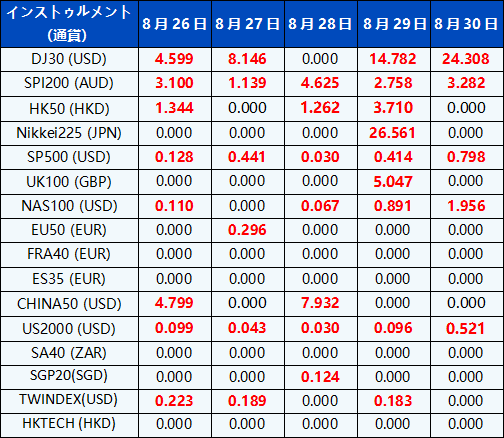 米国株式CFDの調整幅は下表をご参照ください