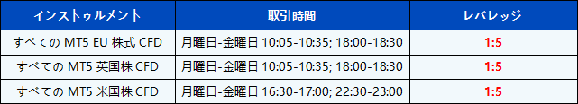 また、MT5で市場終了30分前と市場開始30分後に新たに開かれるすべての株式CFD商品のレバレッジが1:5に調整されました。