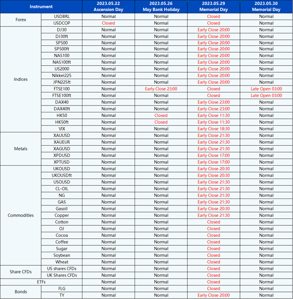Please be advised that the following instruments’ trading hours and market session times will be affected by the upcoming May holidays.