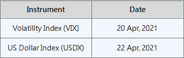 To avoid rollover adjustment charges, clients may choose to close any open positions of VIX before the market closes on 19th April 2021, and USDX before the market closes on 21st April 2021.