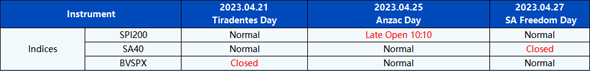 Please be advised that the following instruments’ trading hours and market session times will be affected by the upcoming April holidays.