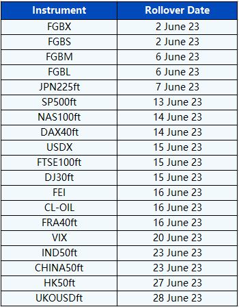 Please be advised that the following CFD instruments will be automatically rolled over as per the dates in the table below. As there can be a pricing difference between old and new futures contracts, we recommend clients to monitor their positions closely and manage positions accordingly.