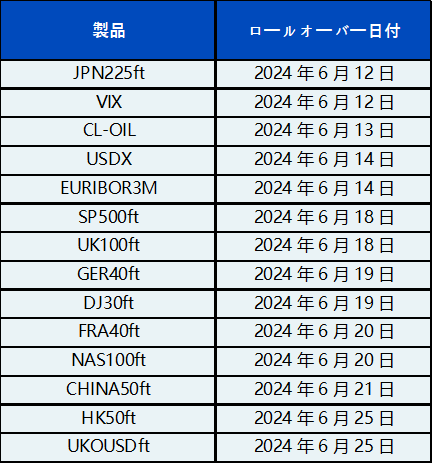 以下のCFD商品は、下表の日付に従って自動的にロールオーバーされますのでご注意ください。新旧の先物契約に価格差が生じる可能性があるため、お客様はポジションを注意深く確認し、それに応じてポジションを管理することをお勧めしております。