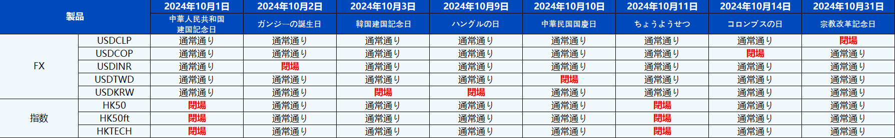 10月の連休に伴い、下記の商品の取引時間および立会時間が変更となります。