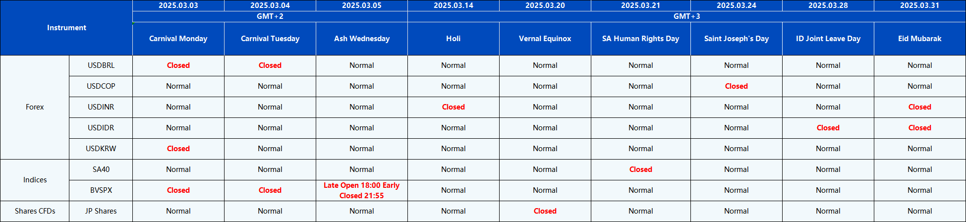Please be advised that the following instruments’ trading hours and market session times will be affected by the upcoming March holidays.