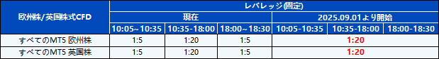 欧州株/英国株式CFDの調整については、以下の表をご参照ください: