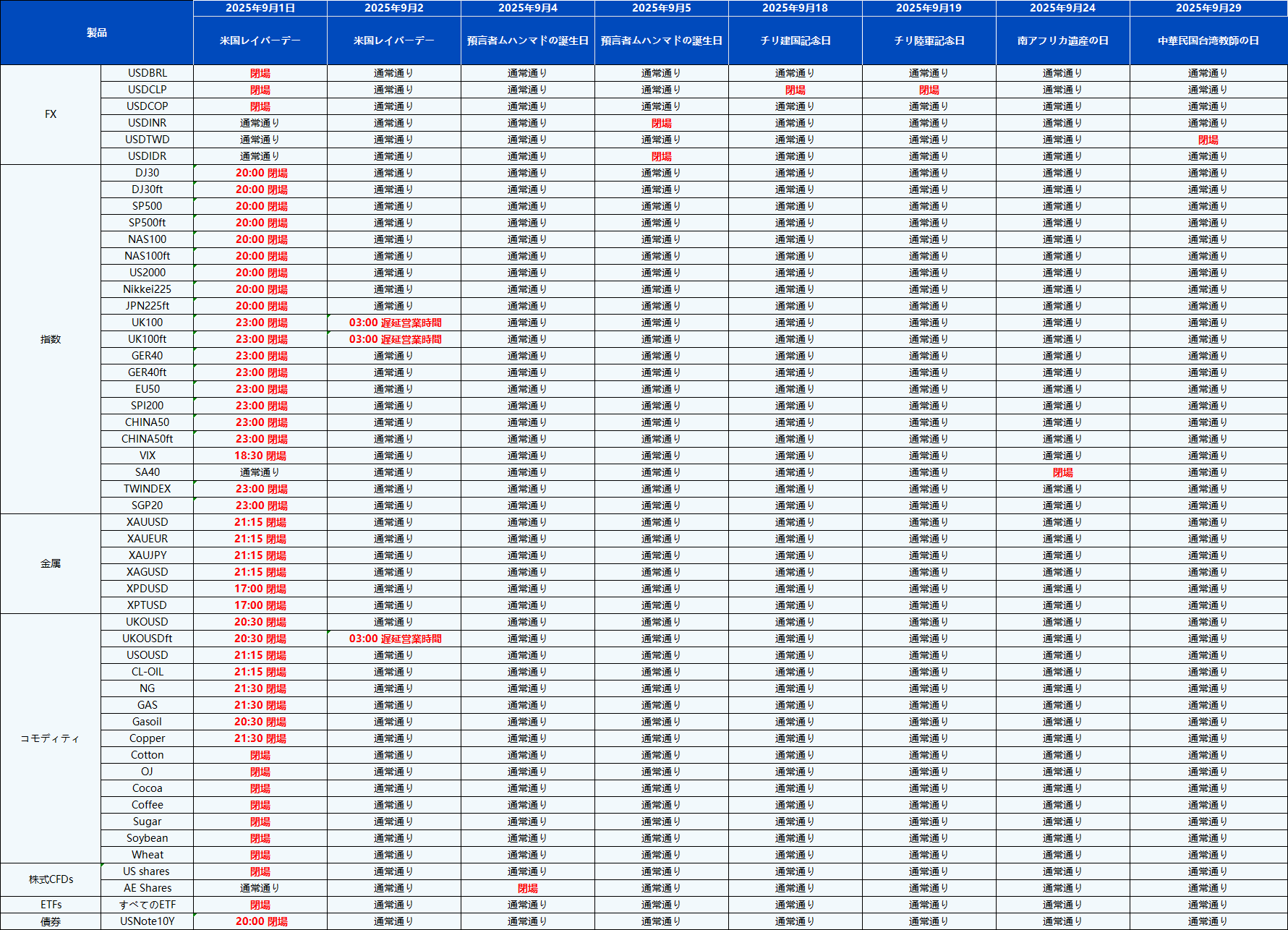 9月の連休に伴い、下記の商品の取引時間および立会時間が変更となります。