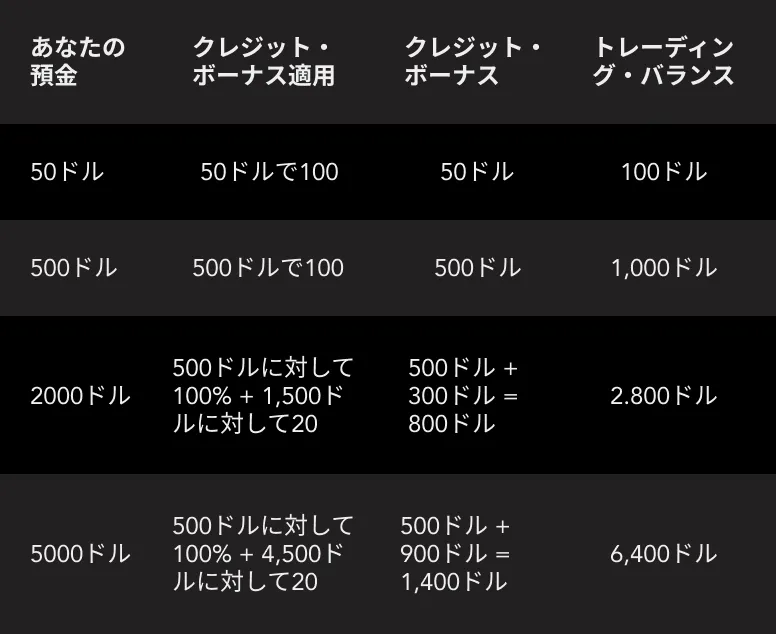 2.プロモーション期間中の新規入金のみがクレジットボーナスの申請対象となります。新規入金には、同じ名義の口座間での資金移動(内部送金)およびコミッション口座からの資金移動は含まれません。