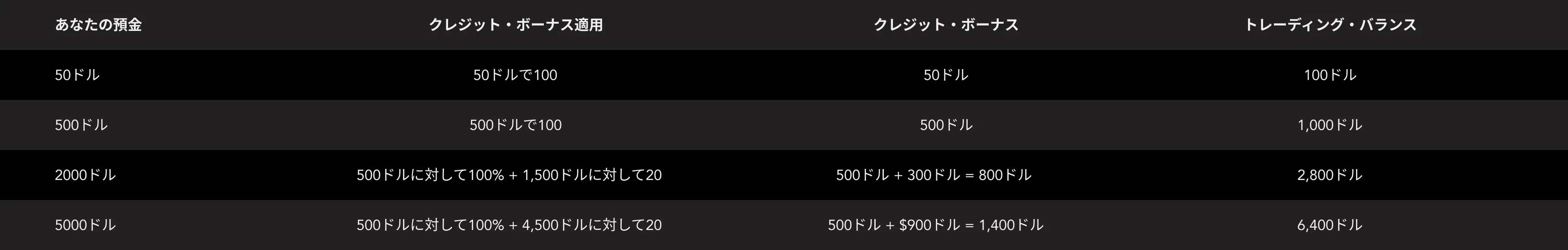 4.ここに定められた基準を満たす対象クライアント(新規および既存のクライアント)は、以下に等しいクレジットボーナス(または取引クレジットとも呼ばれる)を受け取ることができます: