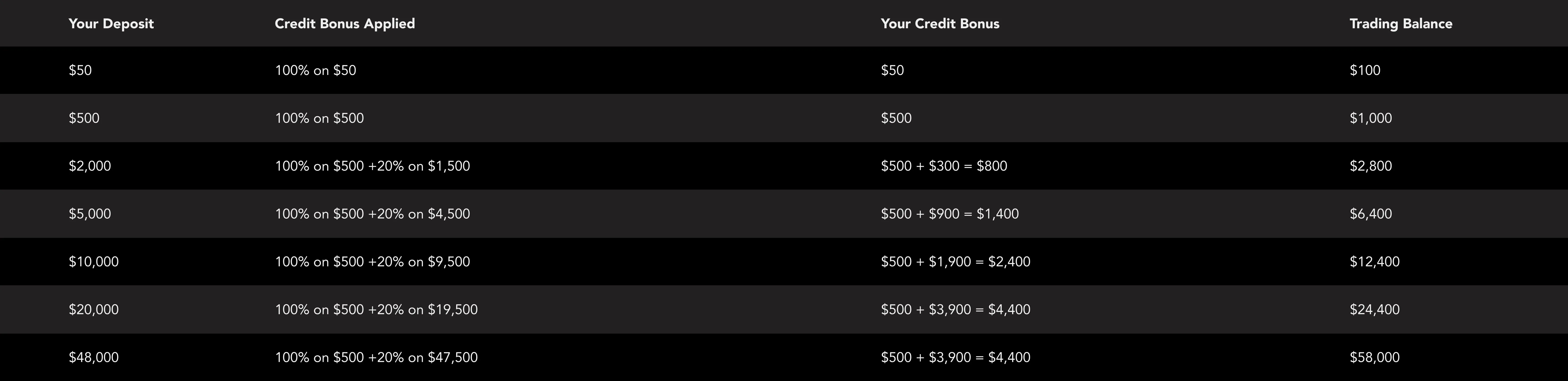4.Eligible Clients (both new and existing clients), who meet the criteria set forth herein are able to receive credit bonuses or otherwise known as trading credit, equal to:
