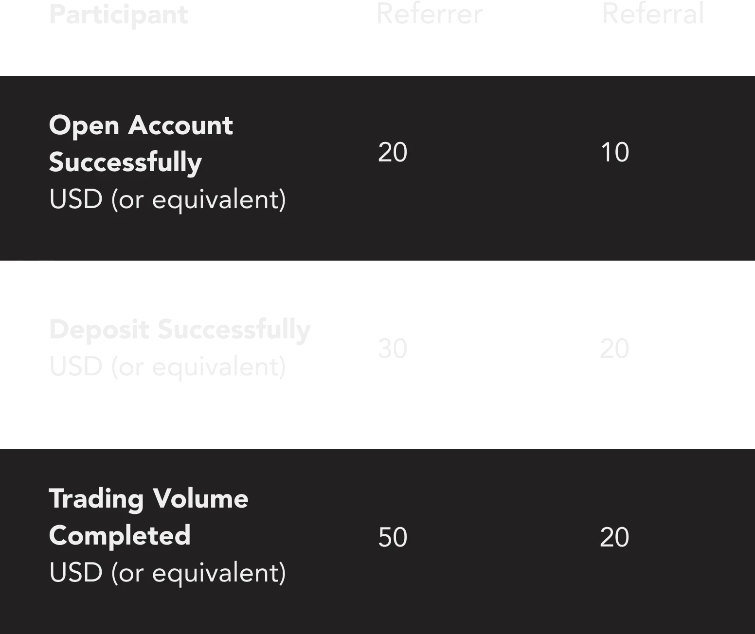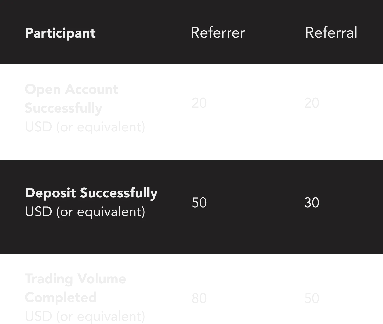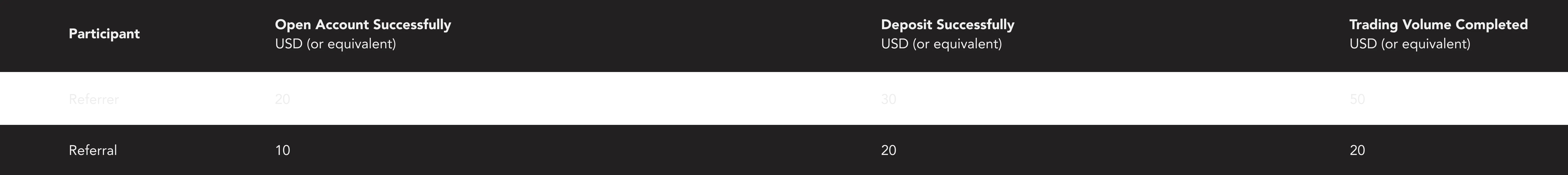 5.If the referrer and referral are from Tier1 countries and meet the following conditions: The referrer and the referral are entitled to receive a reward in the amount of 150 USD and 100 USD (or equivalent).